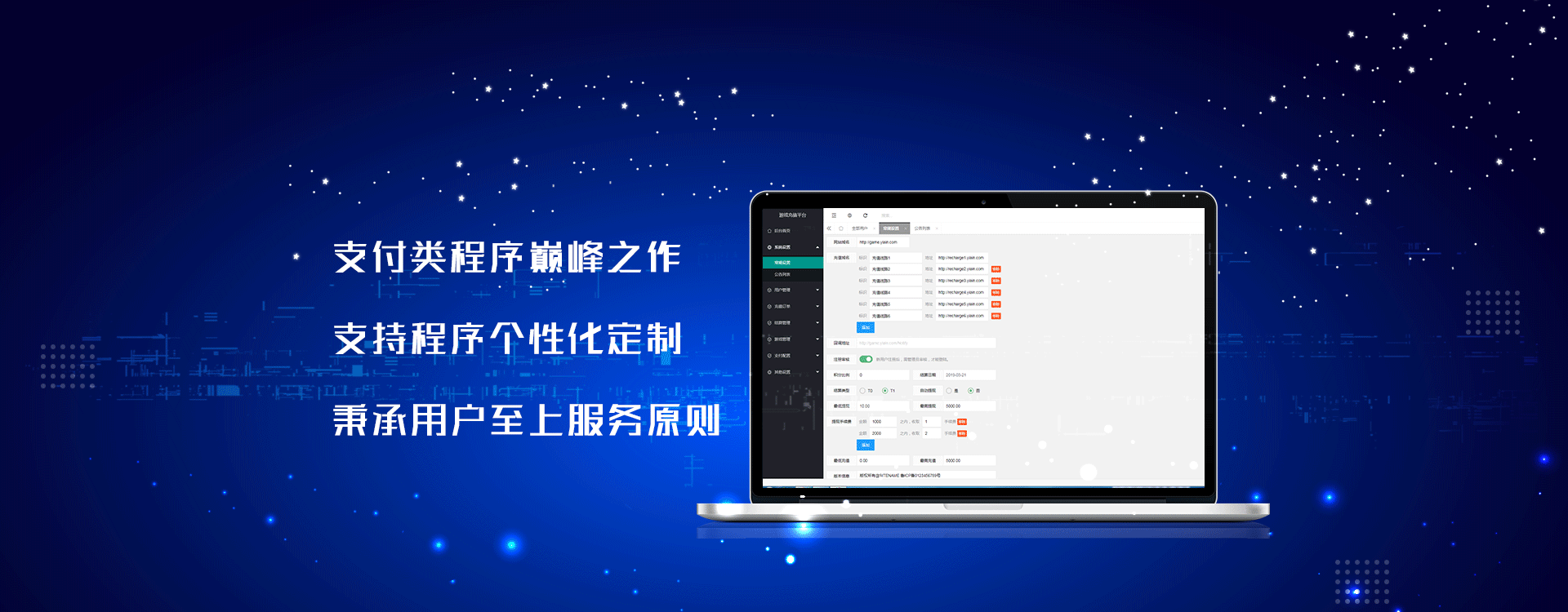 行业一流的团队提供便捷、稳定和安全的技术服务。全平台接入全部主流支付渠道,你无需专门建立一个支付团队也可搭建专属的会员账户系统和多级商户系统;提供标准化支付产品及全面的支付渠道,并坚持阳光支付,只负责信息处理,不参与资金清算,是企业坚实的商业合作伙伴.
